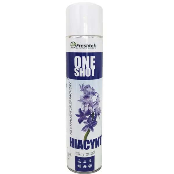 Prosty i szybki w użyciu. Freshtek "One Shot" Hiacynt to profesjonalny neutralizator zapachów, który dostarcza natychmiastowej świeżości w całym pomieszczeniu.